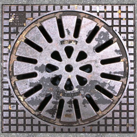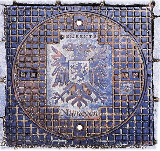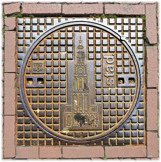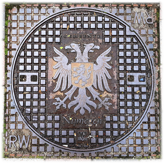 Ähnlich wie in Irland findet man auch in den Niederlanden selten Schachtdeckel mit Wappenmotiven. Bei meinen bisherigen Urlauben ist mir erst einer vor die Kamera gekommen (Nijmegen). Viefach ist einfach der Stadtname, das Logo der Wasser-/Abwasserversorger oder der Eisengießerei auf den Deckeln abgebildet.
