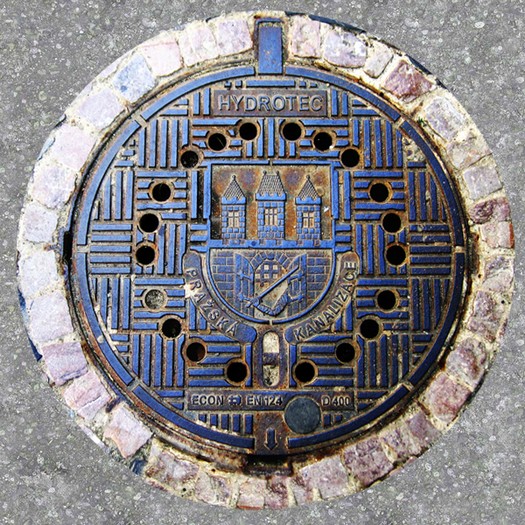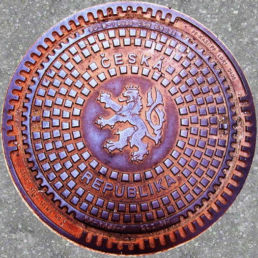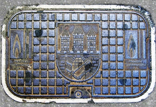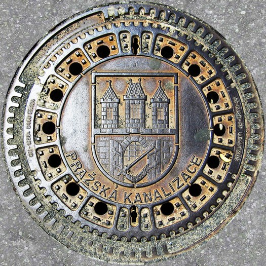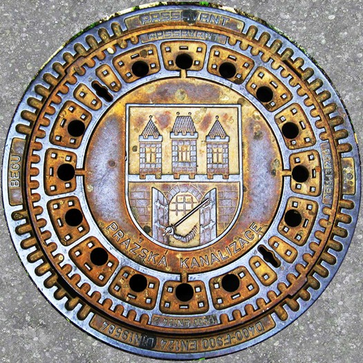 Wie die Städte Hamburg oder Dresden ist auch Prag ein Eldorado für Drainspotter (Schachtdeckel-Sammler)! Es gibt eine Vielzahl verschiedener Hersteller und damit auch Designvarianten. Wasser- und Gas-Absperrkappen und ein Deckel der Tschechischen Republik runden das Angebot der Stadt ab. (Wappen: Wikimedia)